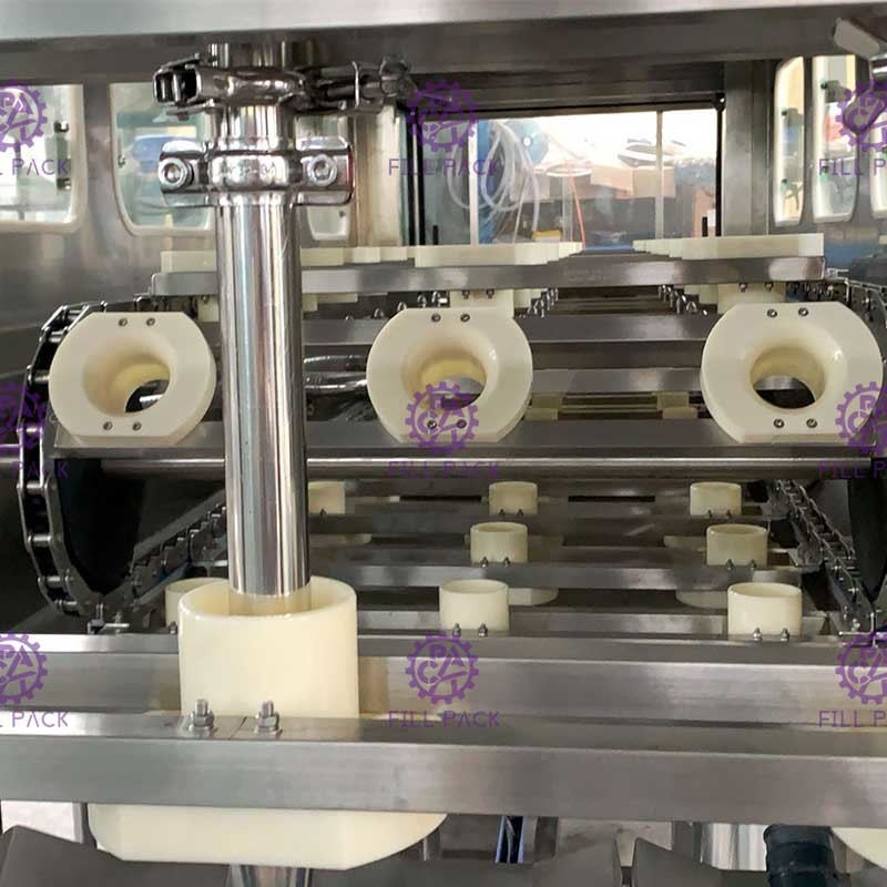 Sau khi chiết rót xong, thùng đầy được gửi đến trạm đóng nắp bằng băng tải, và nắp chai tự động được đặt lên miệng thùng khi đi qua trạm đóng nắp trên đường đi. Sau khi đóng nắp xong, nó được xuất ra thông qua xích băng tải và đi vào quy trình đóng gói sau.