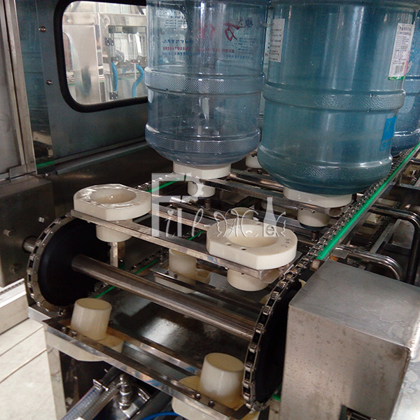 Máy chiết rót nước chai 5 gallon có thể được chia thành 3 bước: rửa, chiết rót và đóng nắp, tổng số 36 trạm làm việc, quy trình làm việc như sau: