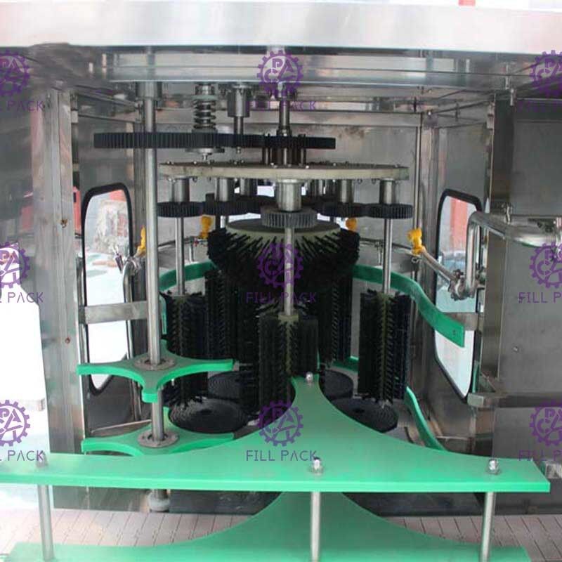 Máy hoàn toàn bị chặn để ngăn chặn rò rỉ nước, khi các chai gallon được gửi đến vị trí giặt, xi lanh sẽ dừng lại 3 chai bên trong và cố định chúng bằng bàn chải và thanh cố định,nước sẽ được bơm và phun ra thân chai, chai xoay cùng với bàn chải; chai sẽ được làm sạch bằng bàn chải và chức năng nước;